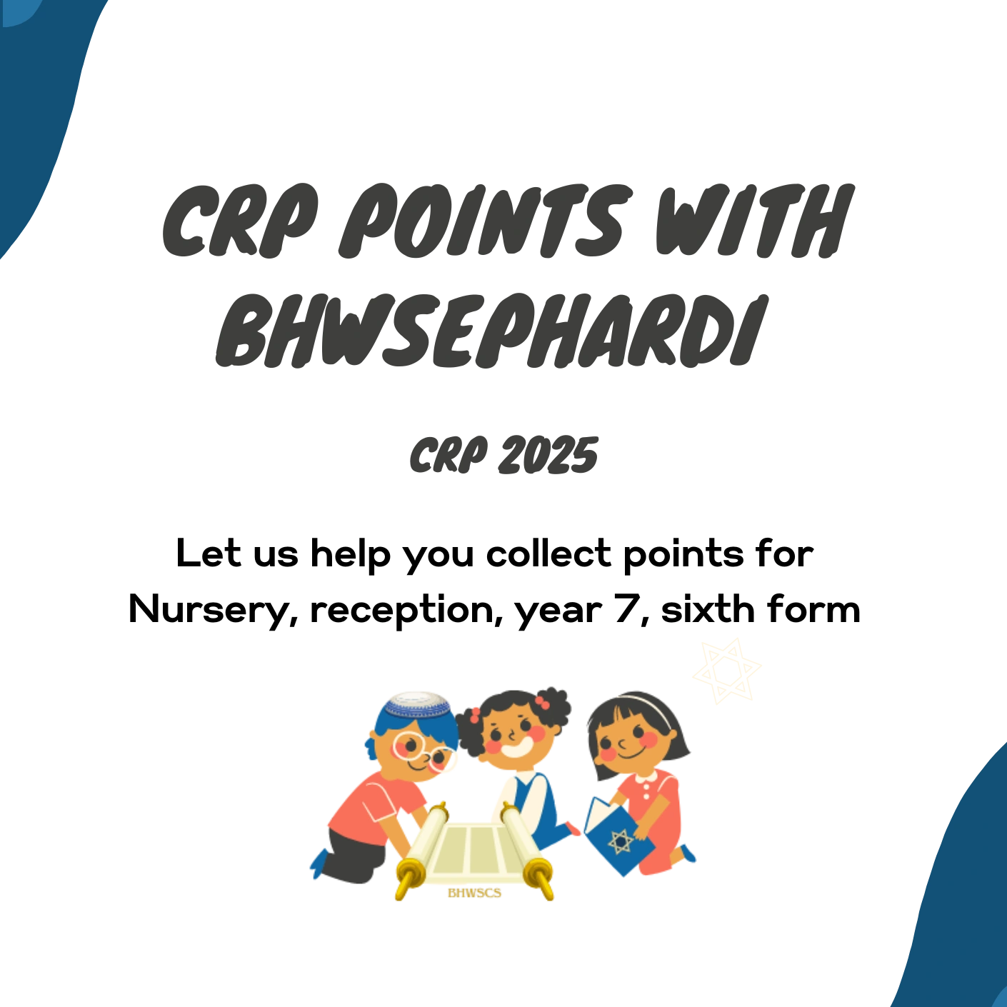 Collect CRP points (Certificate of Religious Practice) for Nursery, Reception, Year 7, Sixth Form.